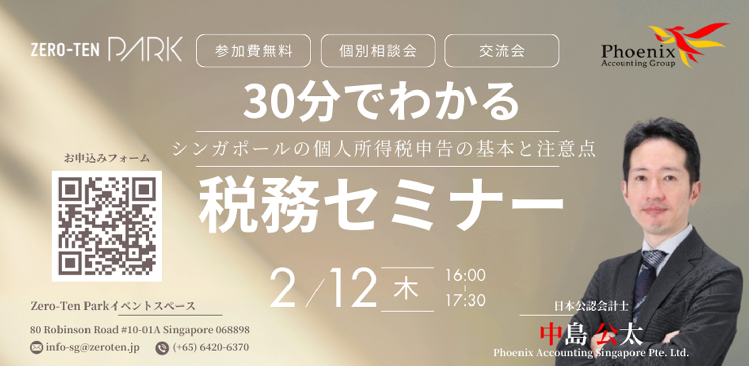 この度フェニックス・アカウンティング・シンガポール日本公認会計士の中島公太が日系シェアオフィスZero-Ten Park様にてシンガポールの個人所得税申告の基本と注意点」の講演を行うことになりました。